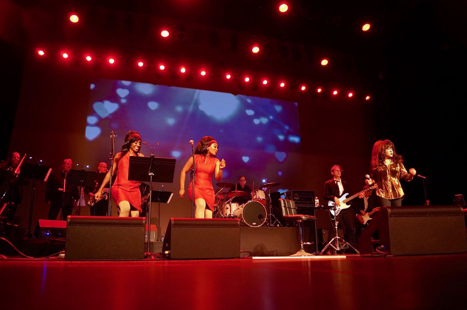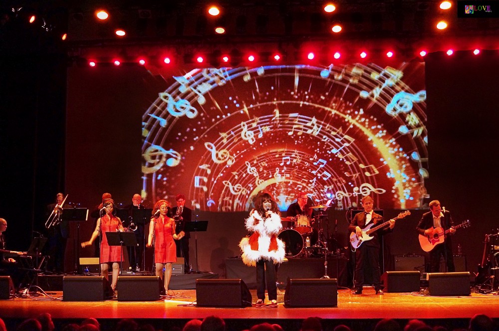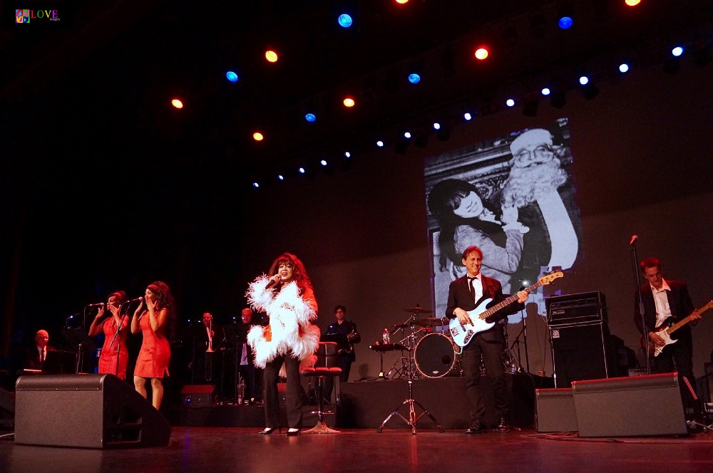 Dressed in a sparkling gold top and black slacks, Spector takes the stage singing the Christmas classic, "Frosty the Snowman." Accompanied by a large band directed by bassist Jeremy Chatzky, Spector looks and sounds as good as ever as she smiles and sings and dances with her backup singers, The Ronettes. As the musicians perform, they put a little bit of holiday cheer in everyone's hearts as a photo of the original Ronettes appears on the large screen behind them.