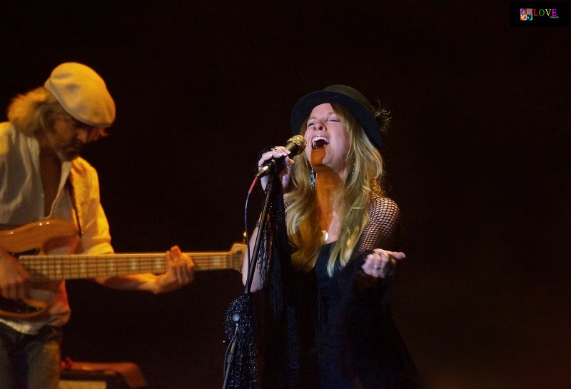Performing a dynamic cover version of "The Chain," the spotlight rains down on Artiglere on bass as Kathy Philips as Stevie sings and plays her tambourine. Phillips' dress envelops her body while stage lights dance to Scott MacDonald's lead vocal.